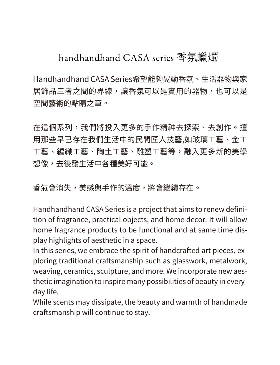 handhandhand casA Series希望能夠晃動香氛、生活器物與家居飾品三者之間的界線,讓香氛可以是實用的器物,也可以是空間藝術的點睛之筆。