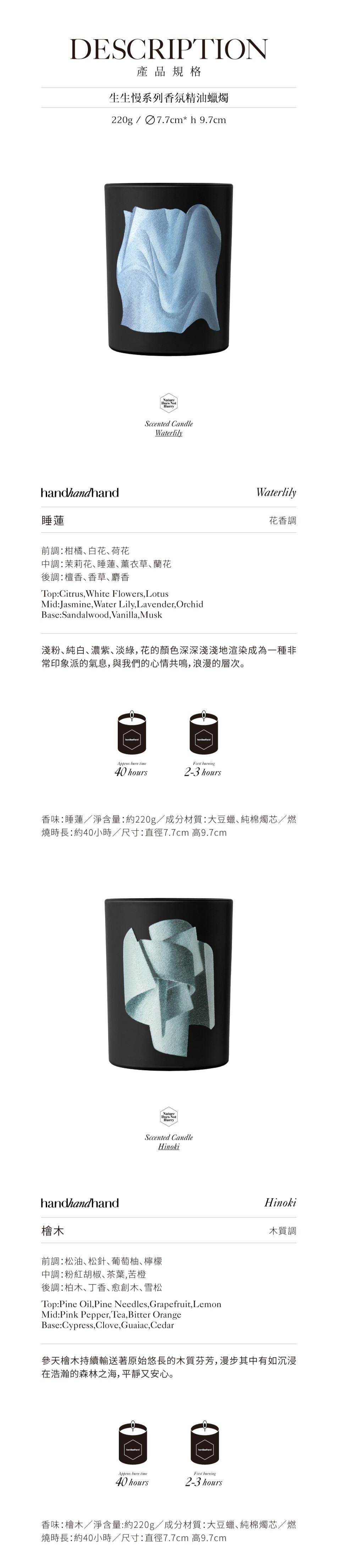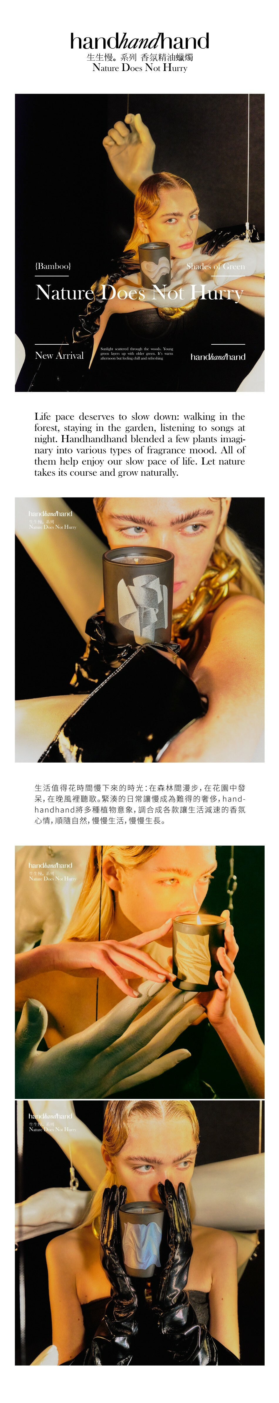 生活值得花時間慢下來的時光:在森林間漫步,在花園中發呆,在晚風裡聽歌。緊湊的日常讓慢成為難得的奢侈,handhandhand將多種植物意象,調合成各款讓生活減速的香氛心情,順隨自然,慢慢生活,慢慢生長。