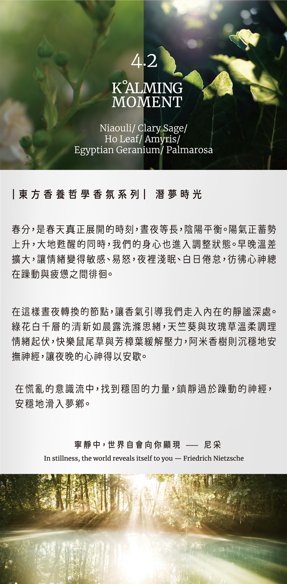 氣味|綠花白千層、埃及天竺葵、玫瑰草、快樂鼠尾草、芳樟葉、阿米香樹