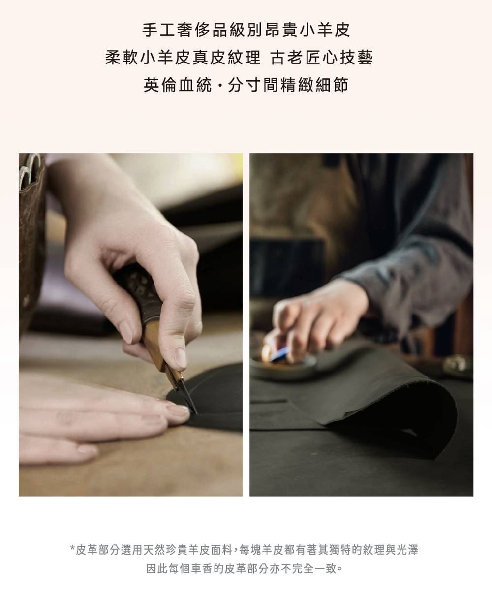 A:小羊皮系列車香,選取天然羊皮制作。每塊天然羊皮皮革更有自身獨特的紋理與光澤,因此每支車香的皮革部分也會出現不一樣的紋理與光澤,屬於正常現象,介意者請勿下單。