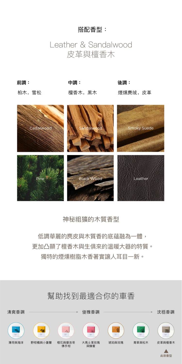 ◾️皮革與檀香木,深厚穩重木質調車內香氛。