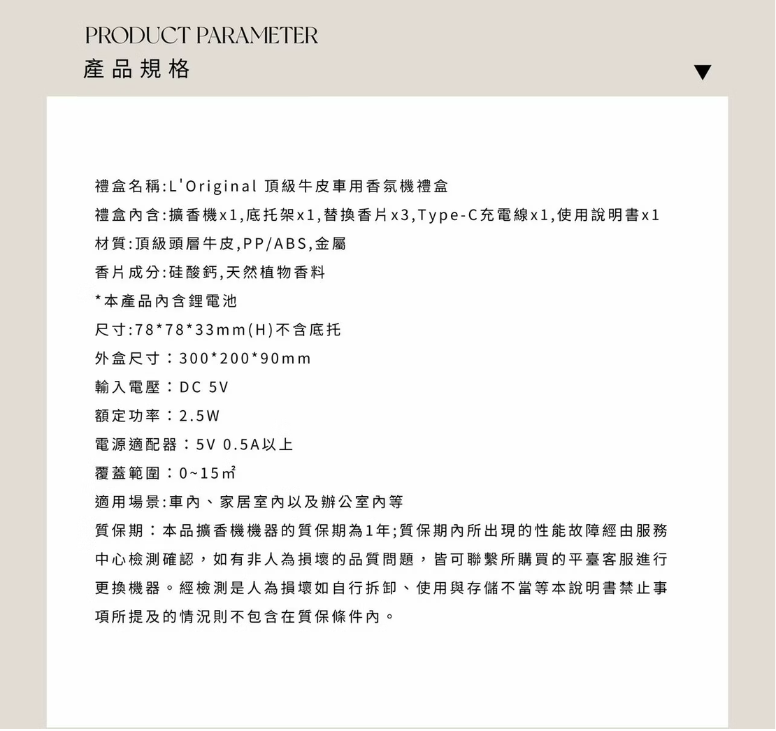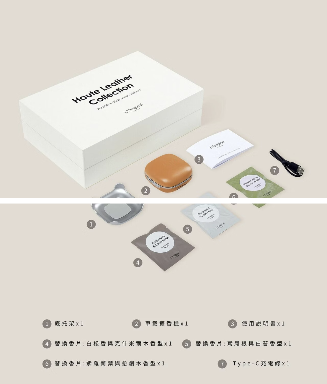 一盒套組內含:1個牛皮擴香機、3款香芯、1個底拖架、Type-C充電線(不含插頭)